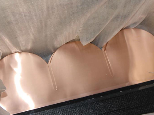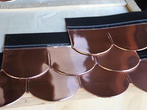 底瓦无搭接不漏水/按屋面整瓦垄长度,作为长条式压制成型,保持陶土瓦之片叠状效果,片间均匀之度则优于陶瓦。金属铜瓦的一垄一长条造型,无搭接、无缝,解决了陶土底瓦片片叠接成垄,片间之搭接缝时逢大雨难灌漏水的难题。